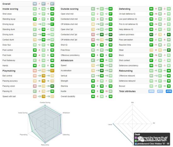 这张粉呆在内线的统治力相当恐怖,全面的内线得分手段,近距离、上篮、扣篮等应有尽有,其中背身能力尤其突出,98的背控和勾手、97的背身后仰加上98的力量让他在阵地战中无往不利。