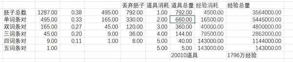策略B:需要1287个胚子,消耗开孔材料=20010,消耗经验=1796万