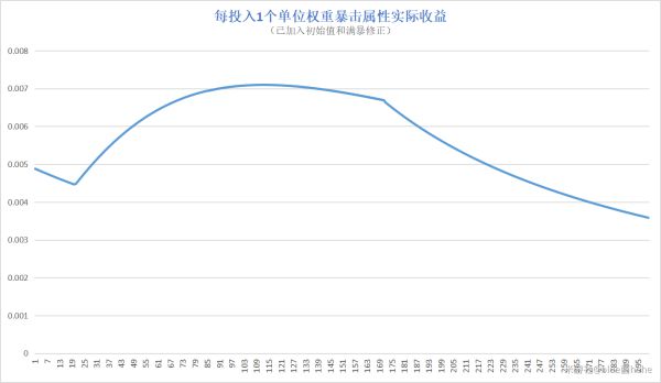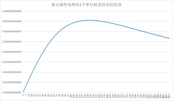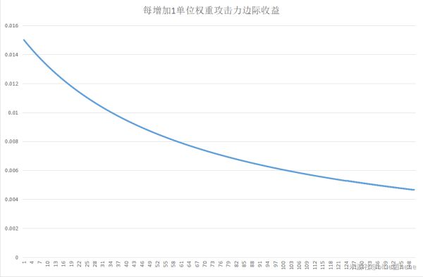以下曲线都是按每投入1个单位权重所获得的边际收益点阵拟合而成的,而一般习惯性地将1%暴击率所占权重作为单位权重,此时1单位权重对应1.5%攻击力加成,再由攻击力曲线无限靠近0时,边际收益的极限为1.5%,与1.5%攻击力加成正好吻合,所故以此作为判断标准。