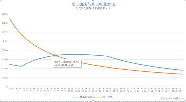 1.交点(x=80,y=0.006865),对应:攻击力120%;对应双暴55/110