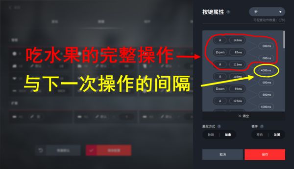 左侧操作的持续时间可以随意,右侧的操作间隔时间为600-600-4000即可,因为吃苹果的动作时间比较长所以衔接下一组动作的间隔要设置比较长的4000。