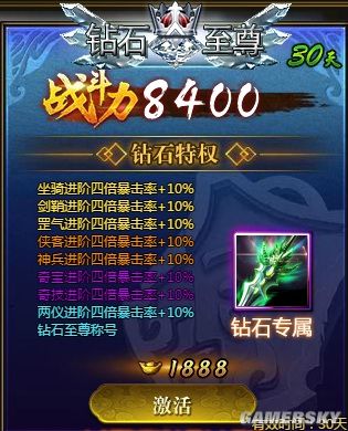 钻石至尊特权主要是为我们进阶服务的,如果有了钻石至尊特权,各系统进阶所需的进阶丹会比其他玩家少不少,钻石至尊是有时限的,1888元宝30天,但是大家可以通过成为VIP8领取激活卡来永久激活钻石至尊特权,如果觉得VIP8太贵了,那么也可以攒着进阶丹然后在某一个月充值成为钻石至尊特权把系统全都进阶了。