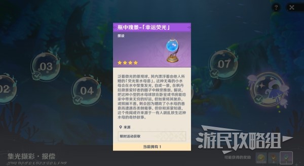 活动时间:2023/09/28 10:00至2023/10/09 03:59 活动奖励:尘歌壶摆设【瓶中瑰景-幸运荧光】、原石、大英雄的经验、精锻用魔矿、摩拉、武器突破素材 参与条件:冒险等阶≥20级并解锁任意枫丹区域七天神像,且完成魔神任务「巨龙与自由之歌」 活动说明:从活动开始的第一天起,每天会解锁一个新的回收区域,共7关。旅行者可以在回收区域内收集「荧光紫水母」,达到一定数量后即可完成挑战。完成挑战可获得原石、武器突破素材、大英雄的经验、精锻用魔矿、摩拉。回收区域中可能会出现「湍流水环」与「湍流水泡」。利用「湍流水环」与「湍流水泡」,可以更轻松地探索回收区域 ※后续关卡更新后会放在第一页,想看之前关卡的旅行者请往翻页