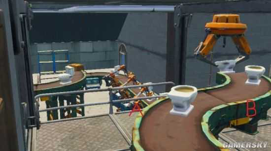 进入内部,我们会发现这栋屋子其实是一个马桶生产线,在生产线的阻碍下,将房屋内部分割成了很多的小部分,例如图中AB两点,在A点的敌人在没有脚步声的情况下就很难发现B点的敌人,危险性大大提高,并且在这样的环境下搜索也变成了一个难事,所以在此最好不要浪费过多的时间,防止在屋内将自己的迷失,最后被别人淘汰。