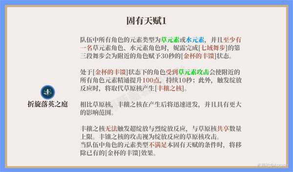 ①.妮露触发固有天赋1(折旋落英之庭)的效果后,队内角色触发的水草反应产生的草原核将转化为丰穰之核。