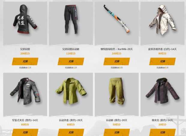 200积分可以兑换兄弟同盟卫衣,120积分可以兑换兄弟运动裤,还有14-20天不等的饰品皮肤等。