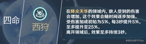 虽然能加强甘雨的副C能力,但在4命上性价比不高,甘雨增伤区包含:冰伤杯,阿莫斯/若水/破魔等武器效果,乐团4/冰套2,天赋大招领域内+20%,还有申鹤,万叶等队友,导致增伤区很容易堆上100%,4命的效果将稀释至约6.25%(间断大招)—12.5%(不间断大招)