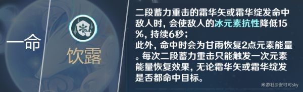 E可多存储一次,使得角色对整个队伍的循环轴容错率提升,本来E技能10s一次,在长轴时会到导致E浪费,或者不得不频繁地切出甘雨放E,而2命后,甘雨可选择每20s释放两次,有更大的自由度,且能在短时间内回复大量能量。