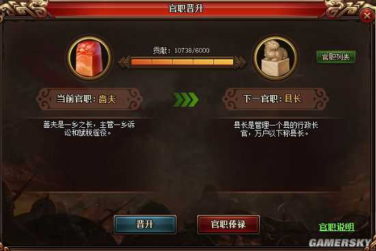 势力官职:是玩家晋升官职的地方,当贡献达到一定的程度,满足晋升的条件时,就可以晋升下一级的官职。另外,这里也是可以领取俸禄的。热血三国3的势力官职是势力的职位,高级官职拥有更多的管理特权;玩家在国战中歼敌、向势力科技捐献战功可以获得贡献。势力的创建者,能直接获得势力最高的职位“国王”。但是,高级官职有数量限制,需要贡献排名高才能晋升;当贡献排名落后,官职会因为别人的晋升而自动降级。如果国王7天不上线,丞相可以通过任务,接替王位。