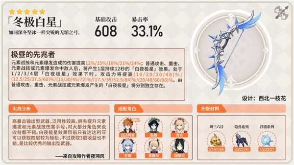 冬极白星:对于达达利亚来说暴击率属性需求是高于暴伤的。大量暴击可以保证达达利亚伤害稳定性,提升元素战技和元素爆发伤害提高都是有效输出提升。白夜极星带来攻击力提升也可以带来有效输出提升,是达达利亚理想的五星毕业武器。同时由于提升攻击力、和提高元素战技、元素爆发伤害这种通用性高的武器效果和高暴击武器属性,也可以作为宵宫、甘雨、提纳里这些角色毕业武器,所以该武器泛用性和强度都高。