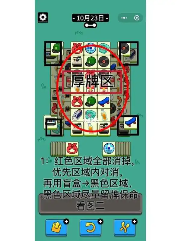 (1)红色区域全部消掉,优先区域内对消,再用盲盒→黑色区域,黑色区域尽量留牌保命.