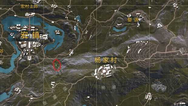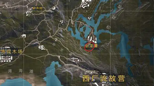 宝藏位置如下图所示,在飞行中可以看到很明显的一块大石头,嗯,往那里飞就对了,从第三张图的红圈位置潜入水下,往大石头方向游,就可以进入卧龙密室开宝箱了~
