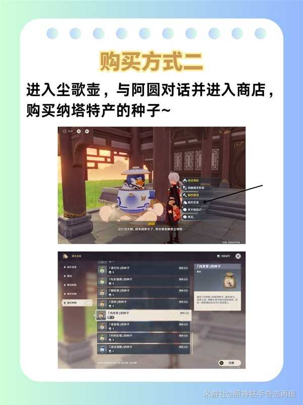 进入尘歌壶,与阿圆对话并进入商店,购买纳塔特产的种子~