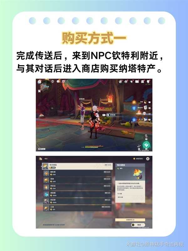 完成传送后,来到NPC钦特利附近,与其对话后进入商店购买纳塔特产。