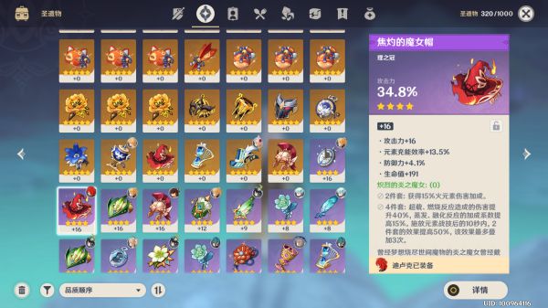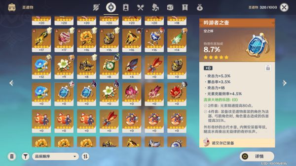 然后当输出的圣遗物都毕业了再去考虑奶妈和工具人,大部分情况下奶妈工具人的圣遗物只需要凑个套装效果,象征性强化到+8这样,基本就可以了