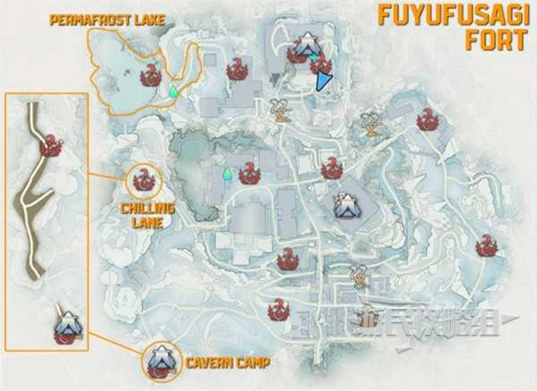 在下图橙色框线所示的区域内,猎杀蓝色蜥蜴即可获得材料。这个小型怪兽通常出现在地图西侧,洞穴营地——寒空小道——恒冻湖范围内。