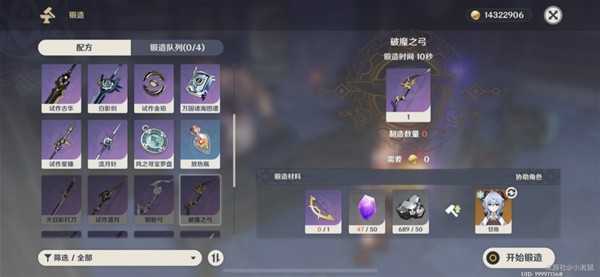 最后,我们来到稻妻铁匠铺找阿创就可以锻造破魔之弓了。(别忘记切换甘雨进行锻造,可以返还15%的矿石)