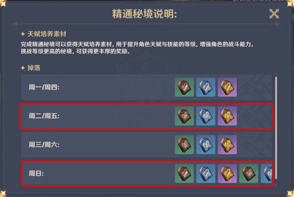 该秘境每日轮换挑战成功后可获得的天赋书类型,其中「巧思」系列天赋书素材仅在每周二/周五/周日可获得;仅在周日时,旅行者可自行选择获取的天赋书类型,请一定要看清并正确选择后再进行挑战。