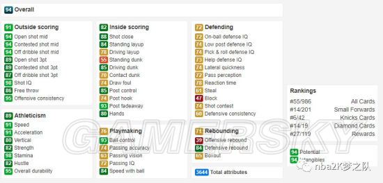 此外,85突扣+金色隔扣达人+金色空接达人,重现了甜瓜当年的扣将本色。而且85背打+93后仰也让安东尼的内线得分手段更加丰富,很难被完全锁死。身体方面,纽约瓜的运动能力依旧出色,其双速达到了91,82的力量也让他无惧身体对抗,完全可以出任四号位来拉开空间,而93的控球更是给与了安东尼更强的运球突破能力。