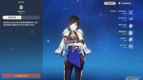 天赋,队伍中每存在一种元素,增加夜兰的生命值。(等于增加夜兰伤害)