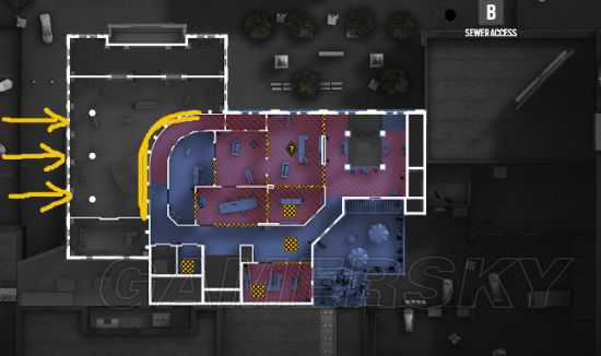 黄色箭头为银行外围的落地式长条窗,就是车库入口处的那面墙,JJ手可以悬挂于此,整个大厅0 1 2楼(除了地下金库)的视野一览无余,二大厅内的敌人由于准具的问题根本看不到此位置的JJ手,只要防守方有人出来必死无疑。具体我有时间会在游戏中截图的。