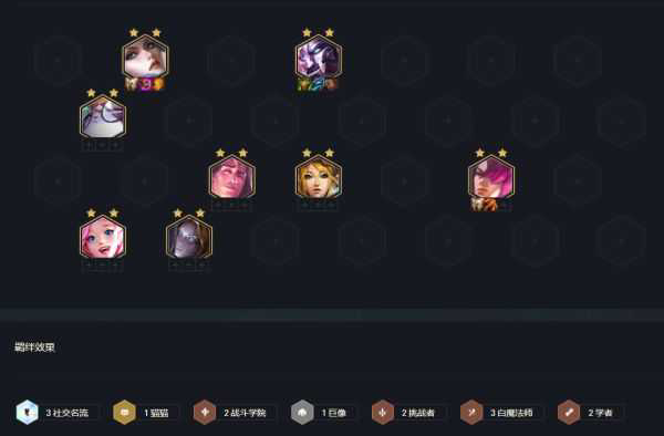 阵容搭配4战斗学院羁绊,可提升永恩的双攻增加伤害;社会名流提供聚光灯某一方面为永恩增伤,另一方面提升全队法力值恢复增加技能释放效率,如果能升级9人口挂加里奥或有名流心、魂直接开3名流羁绊能极大增加续航能力;2挑战者能极大增加永恩的攻速,特别是在造成击杀后加成的攻速还能翻倍。其他羁绊更多是为了阵容辅助白魔法增加魔抗与续航,而学者搭配2名流让队伍回蓝加快加快阵容输出节奏。