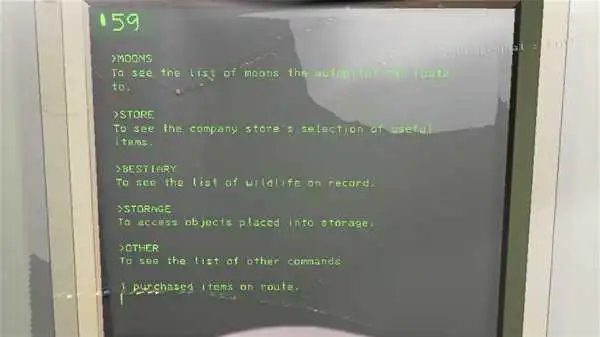 在飞船上玩家可以透过计算机(终端机)远端支援玩家所在的区域,这边指的区域是控制设施内的安全闸门、机枪塔、地雷。而大家也必须透过终端机上的操作界面来购买物品、选择地图,以及管理飞船上的物品仓库等。你需要手动输入指令来执行各种操作,象是输入 Moons(查看地图选项)、Store(商店)、Bestiary(已扫描野生动物图鉴)等等,所有操作都需输入正确才能进行。