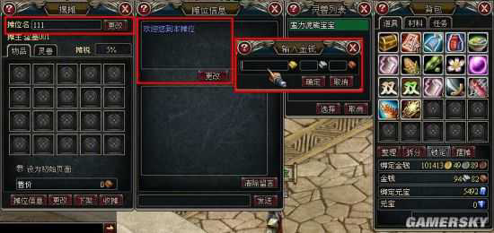 玩家在弹出的摆摊窗口中可以更改摊位名,摊位信息,当玩家选择想要出售的宠物或者将背包中的物品拖入到摆摊物品栏中时,会弹出输入金钱的窗口,在其中输入价格,确定就可以将物品或是宠物上架。