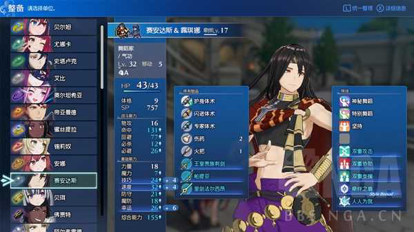 本作唯一的舞男,除贝老师外唯二的再动,重要性自然不言而喻. 虽然重要但是培养起来特别省心,因为自身不能用杖+输出基本等于没有,所以给他学一个坚持就可以当再动和联防工具人. 戒指可以在主角卸下露琪娜后给他用,蹭一下双重协助的连携以及在掉血后依旧可以用结合开盾,以及一些特殊情况开结合技补上一点连携输出. 武器塞个护身体术就行,物品再带点药带点火把就能上岗,简单实用且好用。