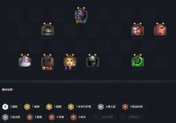 这套阵容就是主要依靠炼金的BUFF触发后的增加的高坦度前排蒙多极限抗伤,后排厄加特超高频率输出。这套阵容如果能拿到即时注射开局就起飞,输出直接爆炸。