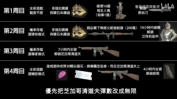 《生化危机4重制版》中的武器装备没办法一个周目全部收集完,必须要多周目才行。下面请看由“鲁路修蓝佩鲁济”带来的《生化危机4重制版》全武器装备多周目收集规划,希望对大家有用。