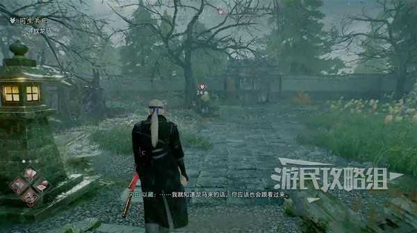 跟着龙马来到目标寺庙,直接沿着楼梯进入最里面的房子里。