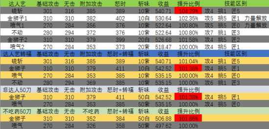 这种情况是在硫斩非怒200刀溢出,金狮子、喷气非怒100刀以内怪物换区为前提的情况下比较金狮子和喷气分别扣掉一个匠换转福,这时金狮子收益明显提升,超越硫斩,但是实际上由于挑战+转福的覆盖率问题,金狮子也只能爆发性阶段输出。