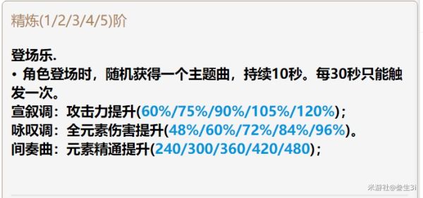 被动可以理解成:10s六星体验卡。在之前这10s是个非常尴尬的时间,给驻场主c显得有些不足,速切型副c切出来打一下也用不到10秒。但是现在不一样了,有国家队的输出方式,10秒刚刚好,30秒冷却也能契合4人小队的输出流程。然后我们再来细分三个被动各自的提升,被动①:纯提攻击力,是策划知道攻击力稀释大还是咋的,这个加成是最多的,60%-120%,光精一就比一个+20的攻击沙要高了。被动②:元素伤害提升48%-96%,也是光精一就比一个+20的元素杯加成高,精五意味着你的可莉每一次平a都触发了融化加伤。被动③:公式翻译一下,反应增伤41%~71%,剧变增伤98%~170%,看上去好像没有元素伤害提得那么高,而且反应也不是谁都能刀刀触发反应的,但这个加成也是十分的超模了。