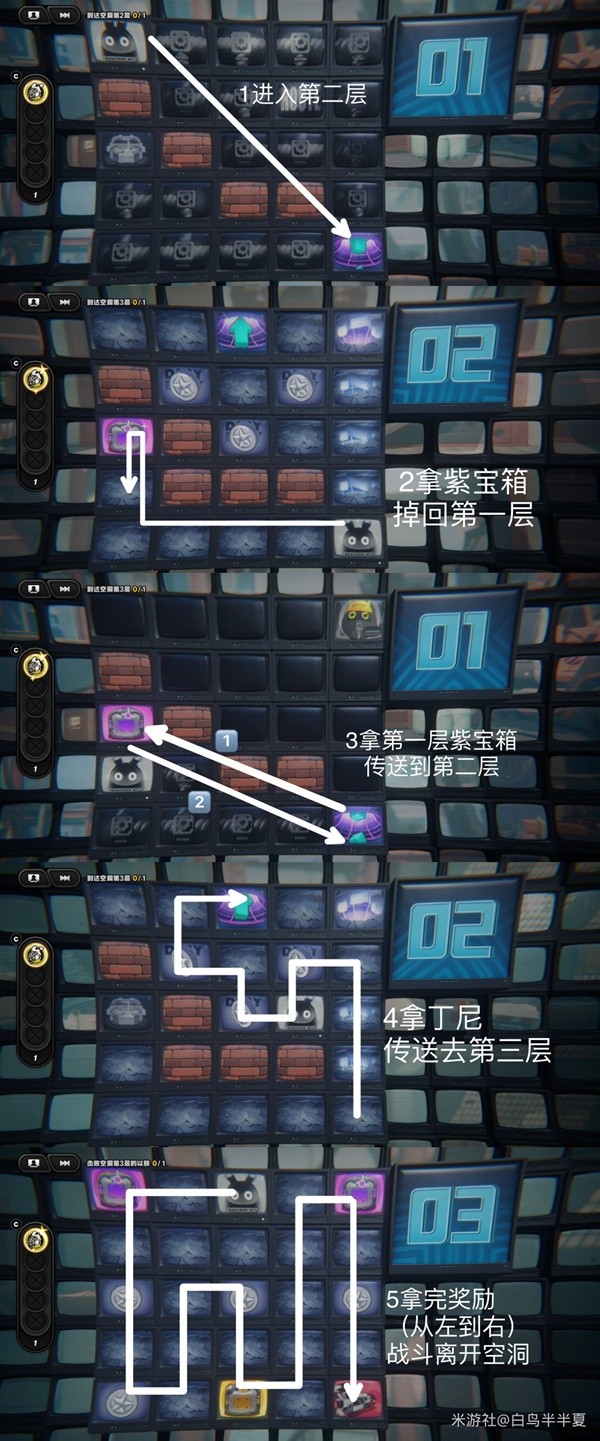 大致顺序:从第一层传送至第二层——拿第二层左边紫宝箱——掉进第一层——拿第一层紫宝箱——传送至第二层——沿途拿丁尼并传送至第三层——拿完第三层所有奖励并离开进入战斗。