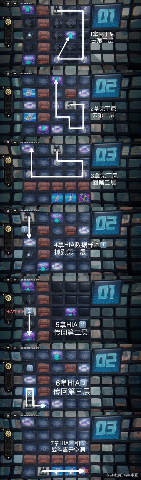 详细顺序:第一层拿完丁尼传送至第二层——第二层拿完丁尼去第三层——第三层拿完丁尼左上洞掉回第二层——拿第二层左上HIA数据样本后,往下走掉第一层——拿第一层HIA数据样本后往下走传送回第二层——拿第二层左下HIA并从下方传送口传去第三层——往右走拿HIA数据并离开空洞。