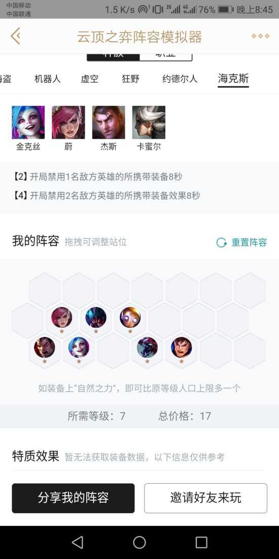 内战时候其实禁止8s钟装备对上边这两套阵容影响不大,这种站位第一你就能禁止一个c位,第二上边俩套阵容不管哪套都很肉完全扛得住8s。但是上边这两套阵容在对战游侠,帝国,斗法的情况下是非常克制的所以为什么说这版本金克斯的阵容完全是s级的,机器人封走位并且帮助萝莉开大,海克斯封走位逼对面分散,分散情况下上边俩套阵容都很肉是最适合的。