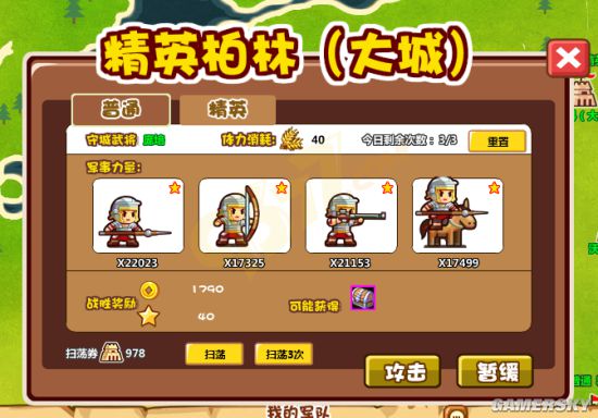 这两个副本的阵容都不同,普通柏林(大城)兵力情况是:1个紫色守城武将——庞培、14682兵力的罗马步兵、11550兵力的罗马弓兵、14102兵力的罗马火枪、11666兵力的罗马骑兵,这个副本的战斗力为;玩家的战斗力只要接近左右,再适当调整下弓兵的目标,相信这个副本会较为容易过关的哦。