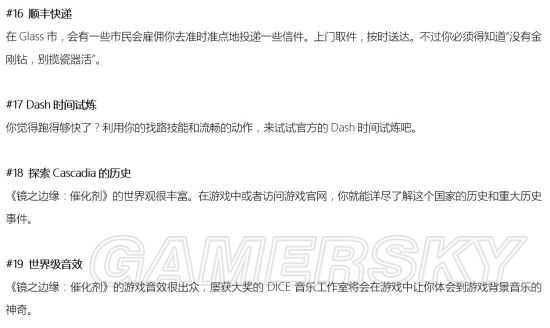 《镜之边缘催化剂》第一人称跑酷的玩法非常有趣,下面为大家带来由eric_jeppesen翻译自官网的《镜之边缘催化剂》64个特点介绍,让你爱上跑酷,一起来看看吧。