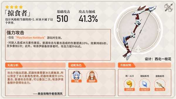 西风猎弓:优秀充能系列武器,非常适合辅助、副C使用。