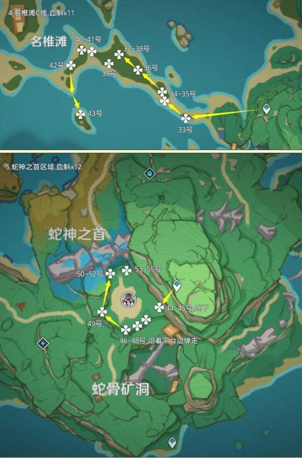 血斛点位仅分布在稻妻地区神无冢和八酝岛区域,其中可采集数量为55株;制作路线时尽量遵循从上往下游,视野高好看清,方便旅行者探索