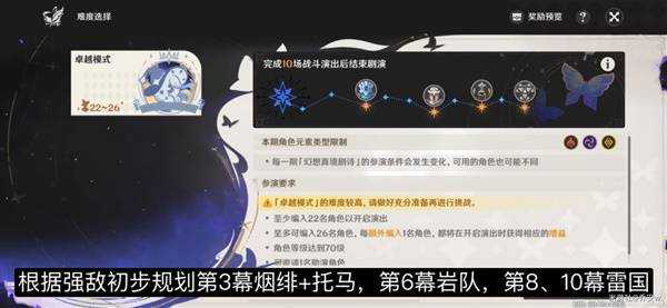 ① 确定元素。比如本期第3幕水形幻人肯定不能用水元素主C,用火元素会更快;第6幕用岩元素会更快;第10幕需要带雷元素角色破除隐身。