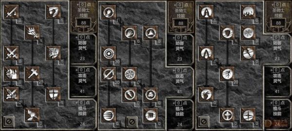 可选技能:核心技能加满后,剩下的点有很多种加法:首先,可以加1点救赎,每次战斗结束后开救赎瞬间满血满蓝,可以大大减少喝药次数,提升游戏体验。其次可以加1点狂热,在打一些血多的Boss的时候可以换上带压碎性打击(CB,下文同)的装备开狂热盾击,快速降低Boss血量。剩下的点可以全加到神圣之盾上,提高自己的防御、格挡率以及盾击的伤害;或是加到抵抗火焰/抵抗闪电上,每2点技能点数(必须是手动加上去的,装备提供的不算)会提高1%的最大火焰/闪电抗性——加满20点抵抗火焰配合水上漂鞋,能达到90%火抗,非常适合职业超市理货员