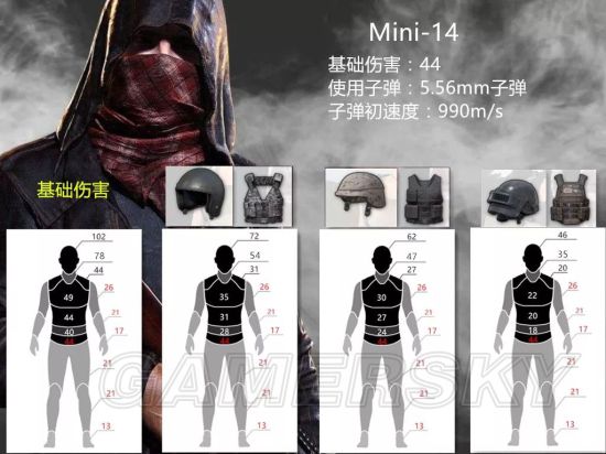 Mini14可能是因为使用5.56mm子弹的原因,基础伤害只有44,无法做到两枪秒三级头,这样的伤害值和其他5.56的突击步枪相差无几。