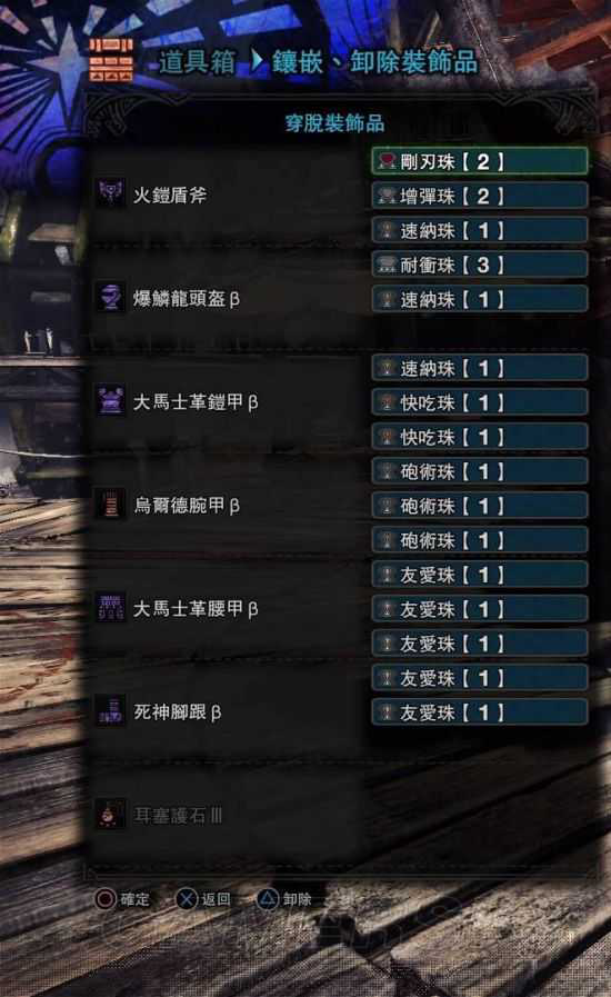 要是珠子没刚刃、增弹、炮术就考虑其它保命向的珠子。如体力、耐X之类的。刚刃也推荐可换为强壁(不过感觉强壁更难打到)