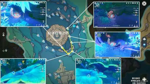 这里是初露之源的采集路线攻略,全图采集共计74个。目前是娜维娅的突破材料。初露之源全部都分布在自体自身之塔的周围,是很集中的。