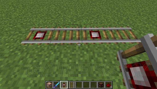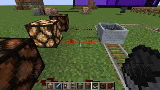 6、可以很清楚的看到,铁轨在经过探测铁轨时,会产生红石信号,和压力板非常类似。