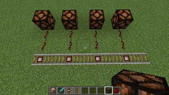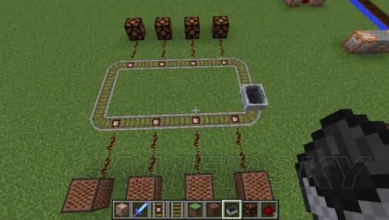 3、为了避免矿车脱轨。我们将铁轨围成一个圈,同时在另一面链接上音符盒。