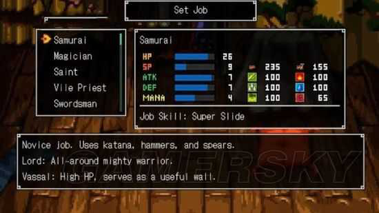 武士(Samurai):适合新手的职业,擅长使用长刀、钝器和长枪,职业技能是超滑行,滑动的距离比较远。