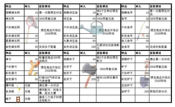 《动物森友会》中玩家可以通过各种DIY图纸来制作工具,但这些工具都有一定的使用次数限制,过了次数就会坏掉,下面带来由“machlie”分享的《动物森友会》全工具获取方式与耐久度一览,一起来看看吧。